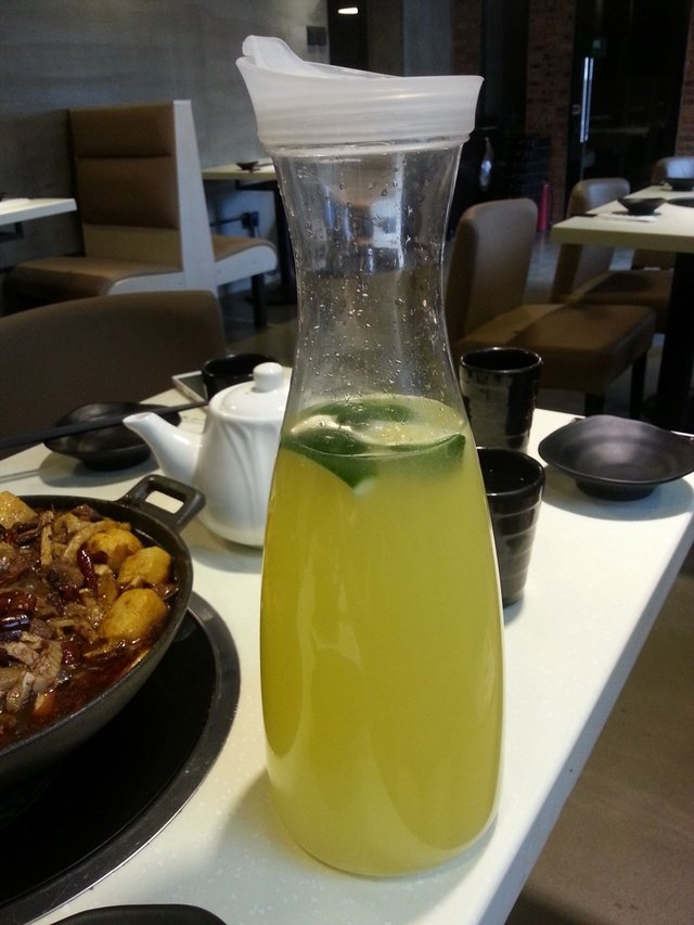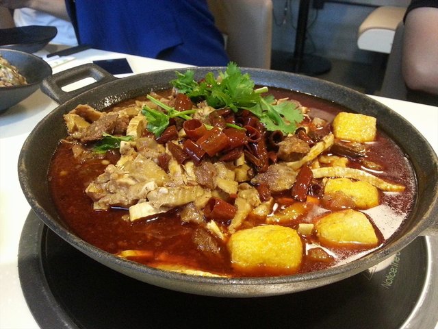 店里主打的牛板筋火锅,点的辣味的小份,铁锅炖肉,味道香气四溢,虽然是小份,量也挺足的。汤汁红艳,里面的牛板筋都切成了小段,入口软烂,味道很 浓郁,香辣可口。锅里还有牛肉和牛蹄筋,量不多,牛蹄筋煮的颜色很透,吃着很有弹性,软绵适口。牛肉入味十足,几乎是入口即化。锅里还有很多的豆腐泡,吸 足了牛肉汤,吃着很有爆浆的感觉。