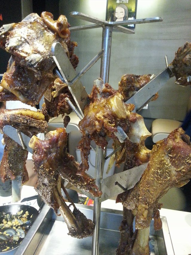 店员推荐的烤三样,点的小份的,里面是羊排,羊蝎子和羊小腿,烤好后挂在了架子上,看着很有意思,而且一上桌就能闻到烤肉的香气,非常诱人。