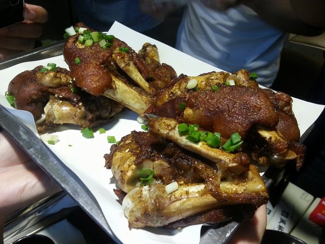 碳烤猪蹄很诱人,外皮烤的微焦,猪蹄里面的筋很多,非常有嚼劲,吃着香辣可口,外皮的味道很浓郁,咸香可口,这是一道美容菜,女生一定要多吃。