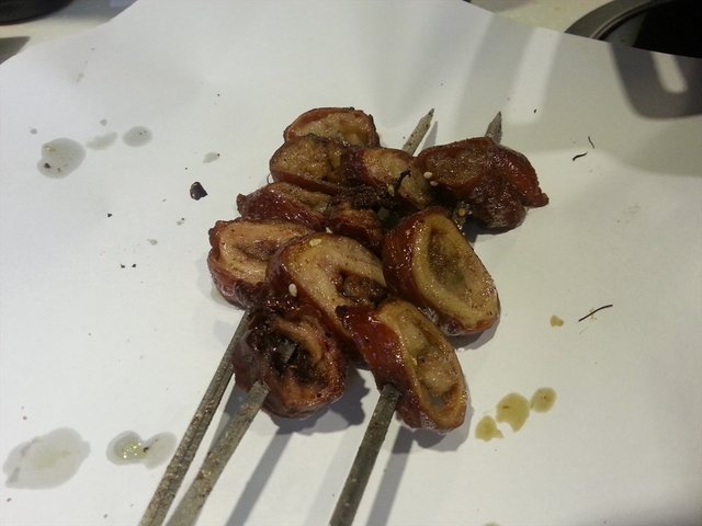 大肠处理的很干净,没有异味,烤的焦香可口,很有弹性,而且越嚼越香。