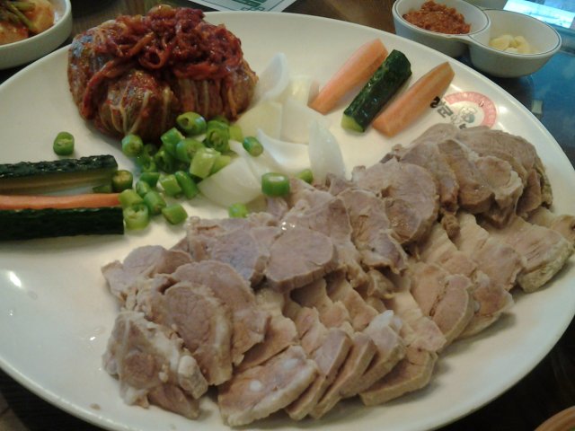菜上的很快,满满的一大盘就是长兴包肉。肉应该是煮出来的,每片大概有0.5厘米的厚度,肥瘦适中,这个的配菜很多,辣白菜,腌黄瓜,酸萝卜,蒜片,辣椒碎和生菜叶等等,用生菜包上肉,再和各种小菜放在一起,沾上酱吃,咬上一口,不油不腻,感觉很不错。但是这个价格呢,感觉真心有些小贵呀:(