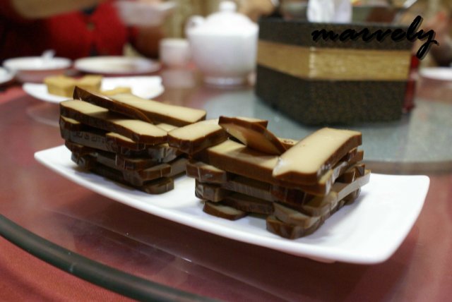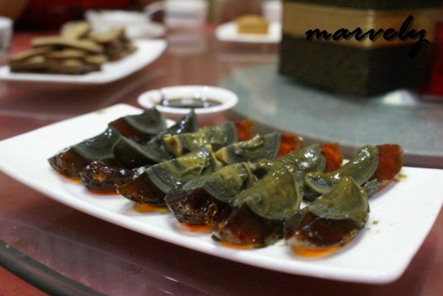 店家推荐说这是最好吃的溏心皮蛋,因为它用的是农家秘制的无铅稻谷壳所包制的土鸭蛋,营养价值很高。在我看来,这皮蛋看起来晶莹剔透的,蛋黄的颜色很深。吃起来蛋黄很柔滑,胶质的蛋白弹性不大,一咬就碎,在口腔里很容易就融化了。