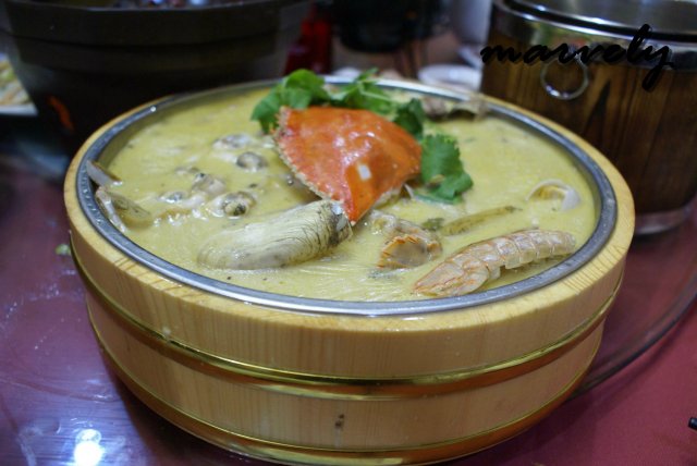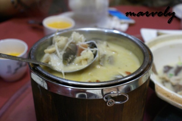 原本是点土鸡汤的,可惜因为限量,于是改点了这道铜盆捕网。这其实是一道江浙菜式,海边的渔民撒网后,拉起后网里鱼虾蟹贝壳什么都有,海上的渔民没那么讲究,常常是把所有种类的海鲜一股脑的倒进锅子里用海水熬煮,味道却出奇的鲜美。这道菜式,味道是鲜咸的。