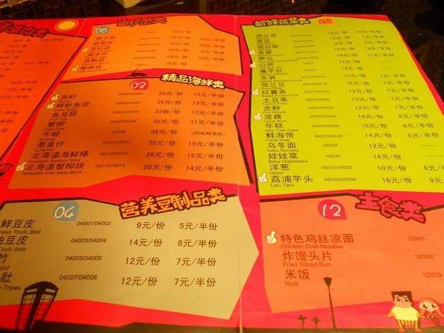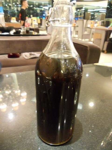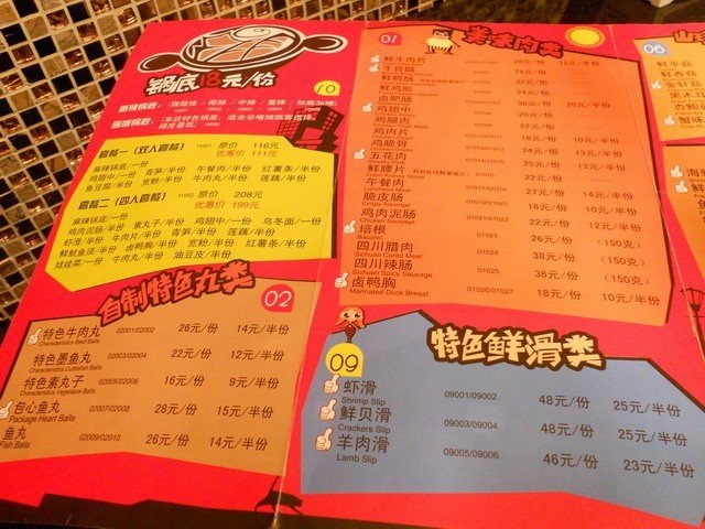 这次和老爸老妈一起,所以选了辣度最轻的酱香口味,惯性思维选了二人餐又另外加了几个菜,事实证明二人套餐实在是不合适,套餐只比单点便宜了5元不说,里面的食材比如宽粉也不是自己爱吃的,点的真是失败啊,这次里面的鸡翅和海带都不太尽如人意,鸡翅太老了,肉有些发柴没有嚼劲,海带也老了,面兜兜的不好吃,不过酱香的锅底还是值得肯定的,酱香浓厚也有淡淡的辣味,辣的恰到好处,但是唯一不足就是锅底油有些多,到最后就油腻了;酸梅汤还是那个味道,很好喝很爽口,就是瓶口有裂纹很不好,盛菜的容器也有磕口,很不喜欢有磕口的餐具,感觉很不好