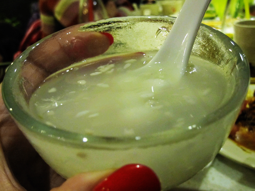 酒酿圆子是加了藕粉的大概,蛮特别的,以后在家也能试试。