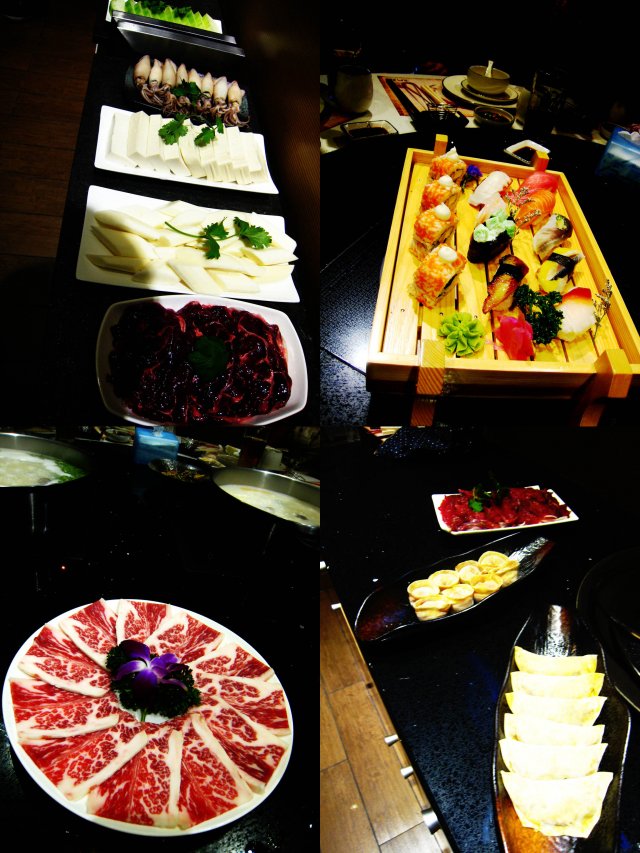 我们一桌两口锅。上锅前先上刺身和寿司拼盘。