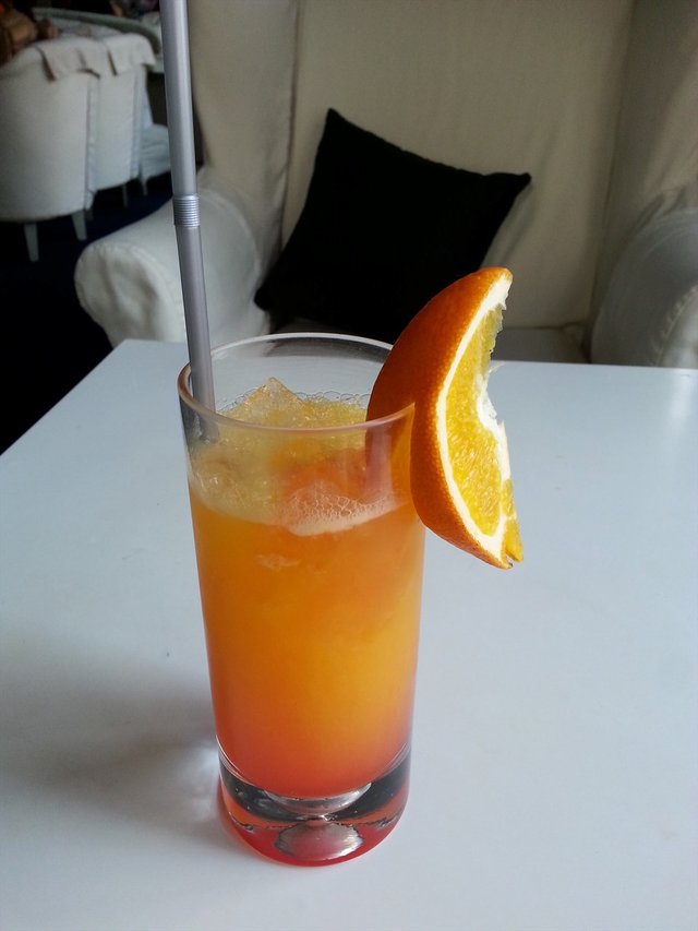 金黄色泽的橙味饮料,应该加了汽水,喝起来很爽口。