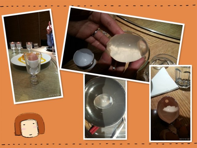 每个人都点了一个神奇的鸡蛋,装在好看的杯子里,真的以为是一个鸡蛋呢,没想到拨开是果冻一样的东西,有一点点甜味,很有意思,仔细一看原来鸡蛋底部有有一个小洞,看样子就是从这里灌进去的果冻液~~