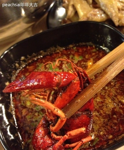 终于上来的,摆盘不错嘛,很干净的样子。金牌小龙虾有2斤左右放在一个不锈钢大碗内,目测一下2个人应该吃的掉,配的特制调味汁,我怎么吃出孜然和果醋的味道,反正有点奥妙,上面一层是辣辣的,蘸到底下稍微好些,戴上围兜和手套开吃,辣了就喝加多宝,真爽,虾处理的比较干净; 秘制小龙虾等的时间更久一些,很入味,一定要把虾剥壳后再次浸一下汁水,超嗲。大概人均吃掉2斤,爽气。