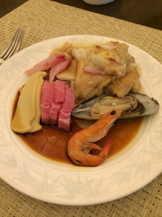 第一轮自然想吃刺身。结果连三文鱼都没有。摆在外面的刺身都不知道是什么鱼来充数的。一咬都是筋筋拉拉,味道相当难吃。吃了一口立马吐掉。只有素鲍能吃吃 其他的烧烤类,黑胡椒牛仔骨相当老,蟹脚还不错。透着浓浓的黑胡椒味道。微辣,很好吃。其他的都没有等到。一想到这个牛排的质量,立马对其他烧烤没有兴趣了