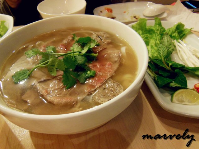 吃越南菜,火车头怎么能不点一道呢。老板说,这道火车头的汤头,是用牛肉,牛骨、猪骨还有各种香料,熬煮了至少4个小时以上的。喝过之后,味道果然鲜美的让我爱不释手了。再将豆芽菜,金不换,薄荷叶,红辣椒圈等悉数倒入碗中,汤的味道更加丰富了,酸辣爽。而且为了突出汤头的味道,店家并没有刻意的添加太多的配菜,但那就已经足以让我觉得吃的很满足了。