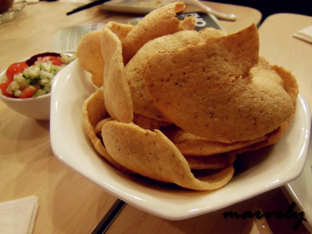 比起我们家里妈妈常常炸的那种龙虾片,这种越式龙虾片明显厚实了很多,通过肉眼也可以看得出龙虾片里加入了一些作料,所以吃起来味道有些鲜咸;而青柠沙沙应该是一种越式拌料的名称吧,番茄、青葱、洋葱被切粒,撒过青柠汁,堆些在龙虾片上吃,厚实的龙虾片碰到清脆的沙沙,吃起来也变得清爽了。