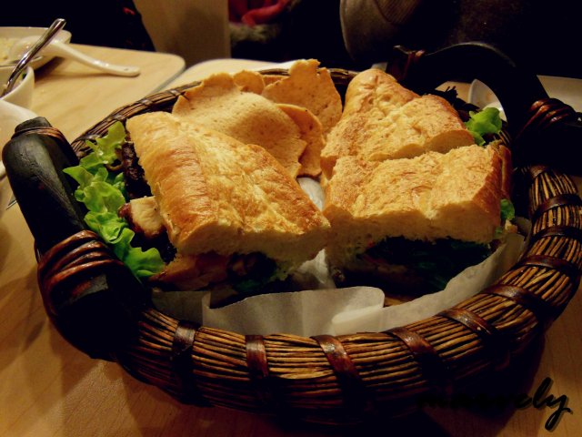 三明治的面包片用的是法棍,不过和我们常常在面包店里买的长长的法棍相比,它们松软多了,但并不是法棍的韧性。配合着生菜和鸡排,香香的。