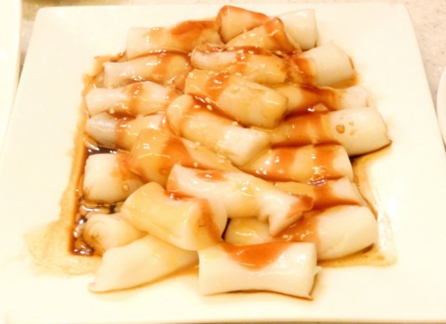 肠粉跟我在广州吃过的那种完全不一样,不是薄薄的澄面皮裹着蔬菜,而是若干个小小的类似小年糕的长条,面皮比较Q,里面没什么主料,上面淋着咸鲜味的汤汁,味道还可以,可以划归主食范畴。