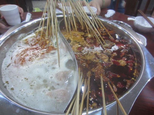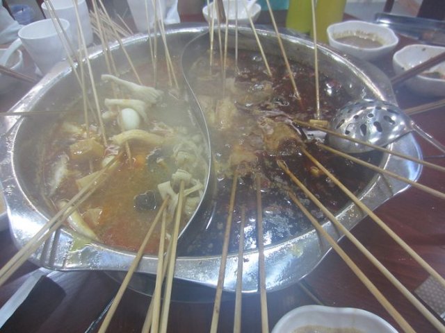 点了一个鸳鸯锅,类似火锅那种的。很快就端上来了,辣锅那边要的微辣的,最后发现微辣也挺辣的,可能成都那边的辣度和北京的辣度不太一样。