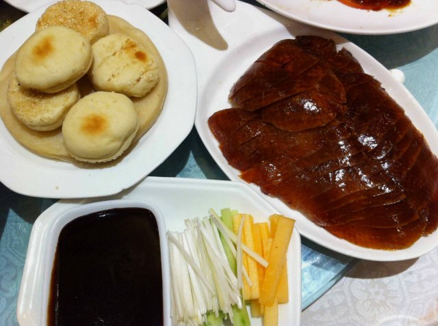 我猜是精品的,因为一般精品配菜里才会有哈密瓜条,除了荷叶饼也才会配开口烧饼吧?鸭子外皮枣红色烤得不错,全聚德现在也不过如此