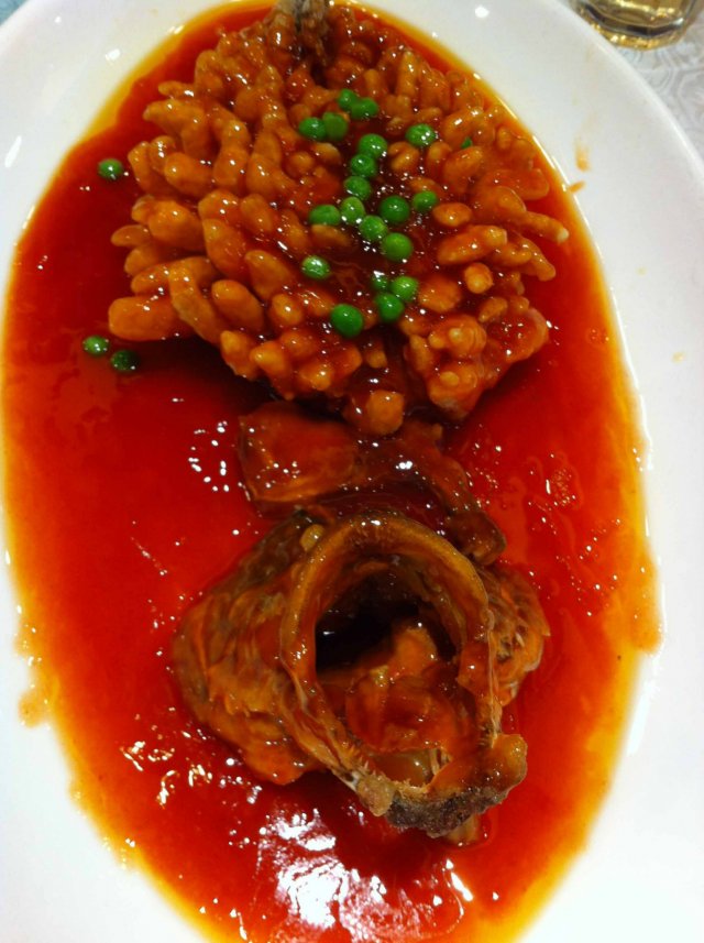 造型很漂亮,鱼身上那几颗碧绿豌豆点缀得很好,裹得面粉有点多,酸甜口,我一般最多两筷子,再吃就会腻了,糖醋里脊也是如此