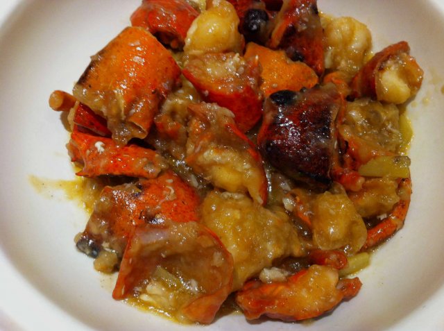 看着红呼呼的带楞带角的一堆块块我还以为是螃蟹,后来吃的时候才发现是龙虾啊!之前只吃过整只的清蒸做法,第一次吃这种用葱姜,切块爆的,每块肉都很饱满,外壳太硬根本咬不动,要用筷子一点点桶出来,费劲搞出来的虾肉吃到嘴里自然感觉鲜美,这个上桌后我就全跟它较劲了,哈哈