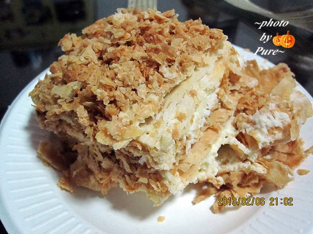 回家后还真不舍得打开金色丝带的蝴蝶结。里面的酥皮很脆很好吃。当中夹着好几层奶油。切蛋糕也是个技术活。拿破仑切起来酥皮的屑屑都掉下来了。不过我把屑屑头放在盘子里,一起吃掉也很不错