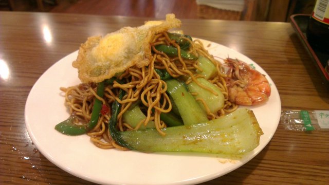 大虾烩面,这个就是上面有两只不怎么新鲜的大虾,不过面感觉还不错,味道挺好,不会太干