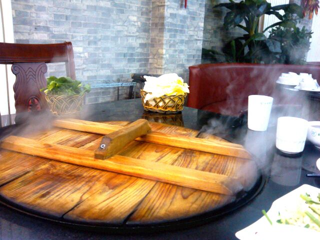 最有特色的还是他家的大锅,真的是超大个,一个桌子被它占去了大半,上面的木盖子都有些油光了,估计是常年被炖菜薰出来的。