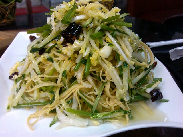 先上来的是家常凉菜,里面有白菜丝、黄瓜丝、豆皮丝和小葱段,看着没有什么颜色,吃起来确实酸甜口,微微用辣椒油浇了一下,味道不错呢。