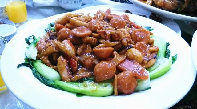 【海鲜丸子炒油菜】有大虾、鱿鱼等海鲜类,鲜嫩,丸子Q弹,搭配青青的油菜炒制,挺不错。