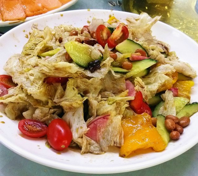 【大拌菜】颜色丰富,蔬菜种类繁多,生菜、黄瓜、圣女果、青红辣椒、花生等等,营养全面,爽口的很。