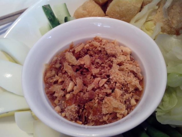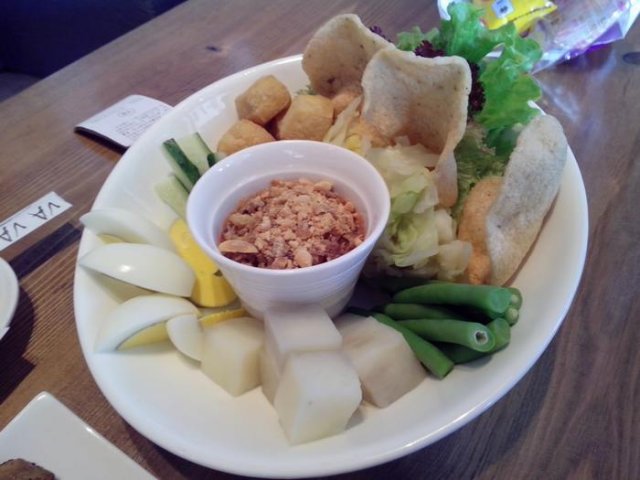 印尼“咖斗咖斗”沙拉:“咖斗咖斗“,即中文混合的意思,用自制的花生酱蘸着新鲜的各式青菜和素食,特别是那个花生酱,甜甜的略辣,帮着花生碎和一种麦片,直接吃都好吃。鸡蛋、豆泡和江豆、青菜都让嘴巴感到清新。
