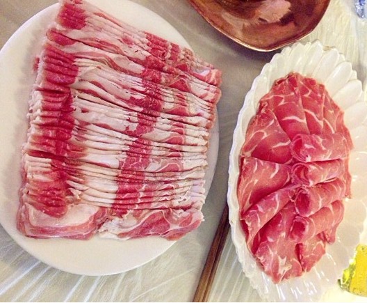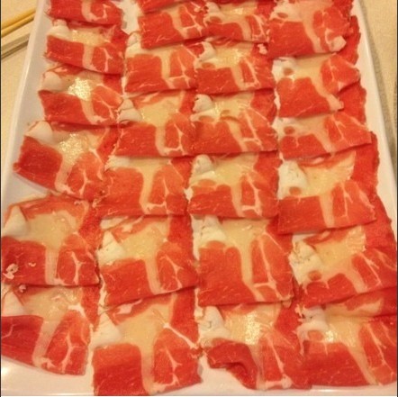 2、羊肉:有手切的有机器片出来的,肉量也都较大,肥瘦各占一半吧,其实肥的多些更香些的,肉很紧实不散,下锅后特别快地成熟,羊肉味十足,味道正宗噢,货源应该不用怀疑。