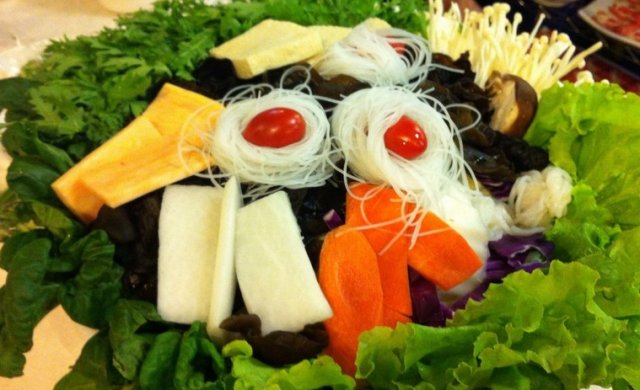 4、蔬菜拼盘:有粉丝,有豆腐,有萝卜及时令绿叶时蔬,种类多,菜量也较大。