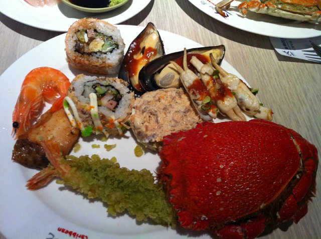 朋友过生日的时候请客去吃的,每个人198元,还蛮贵的,这还是中午的价位,晚餐更贵,好在东西还挺全的,品质也还不错,也就忍了。地方很大,每选一次餐觉得走好远,还好没听说要限时间。东西很全,各种中餐、西餐、韩餐、日餐种类都非常丰富,基本能想到的自助餐类可以有的美食它这里都能找到。冰激凌是哈根达斯的,能感觉到很高端,毕竟外面一个球要卖30多块呢,只可惜每人只能领一个。牛排特别好吃,我自己吃了好大一块儿。火锅是最后快离开的时候点的,金针菇、生菜等的食材都很新鲜,虾的个头也很足呢。总体来说,价位还是小高吧,东西太多太全,眼睛大,肚子小,真的吃不过来。