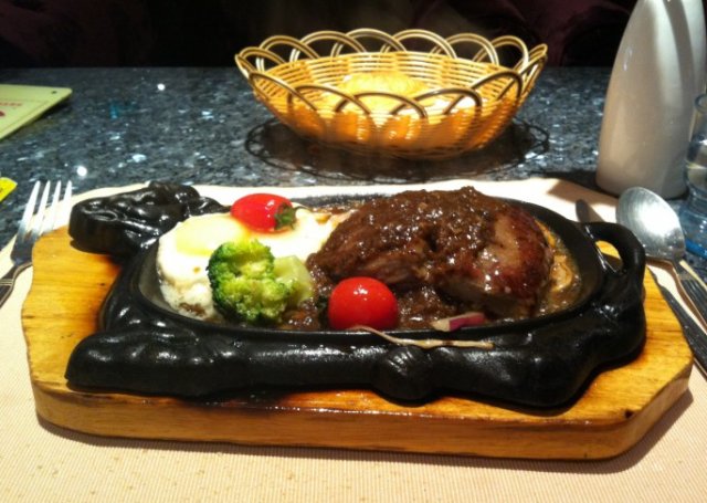 黑椒牛排:盘子很特别,是一头牛的造型,很有创意。牛肉,肉质鲜嫩,要的8分熟,感觉有点全熟的,下次尝尝7分的。除了牛肉,还有一个鸡蛋和蔬菜配料,牛肉量不小,保证能吃饱。