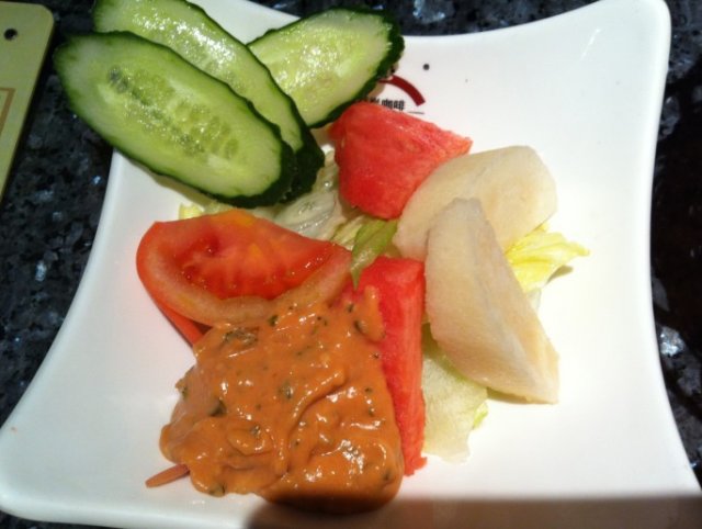 蔬菜水果沙拉:里面有黄瓜 西红柿 还有水果梨,配上特制的酱,很爽口,而且能提起人的食欲。