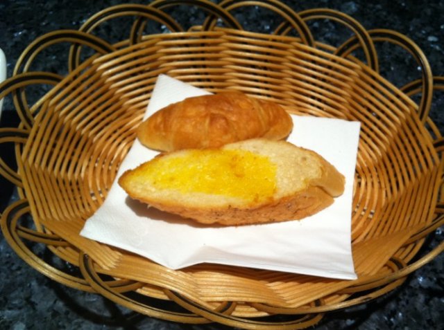 饭前面包:一片烤的蒜香面包,一个牛角包,牛角包软软的,但是不像新做出来的,一般吧