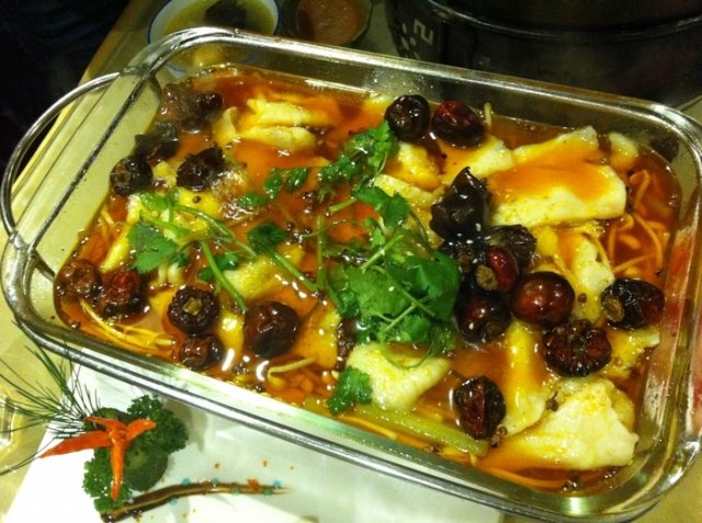 香辣鱼片,其实一点都不辣,鱼片片的很大很完整,上浆以后挺嫩的,浮油略厚