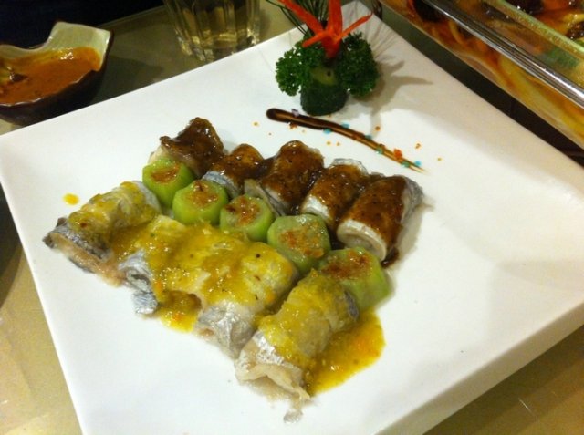 双色带鱼,做成卷装,一边泡椒一边黑椒汁的,感觉有点点腥,但是去了骨的,吃起来比较方便