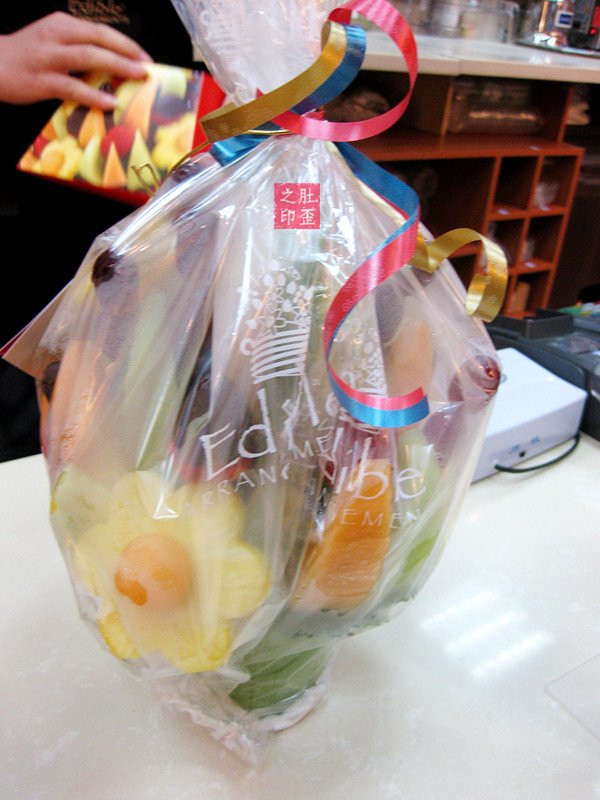 店员帮忙给我包装好带走, 虽然是小号仍然需要硕大的口袋装着,因为都是用新鲜水果制作成的花朵非常沉。
