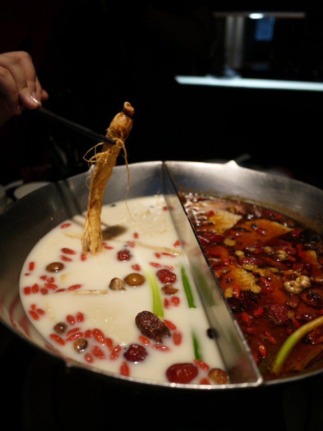 鸳鸯锅底两种风味,白汤人参汤底,红汤微辣,