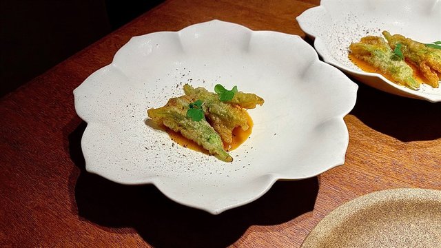 融入日式烹調手法,運用左天婦羅炸物做法,先係秋葵內釀入雪耳、菇菌等材料,表面再沾上炸漿非常之薄身,炸油明顯上新表面炸至微黃顏色,外脆內軟餡料入口爽脆豐富,再配上酸酸甜甜自家製柚子醬汁平衡油膩感,讚👍🏻