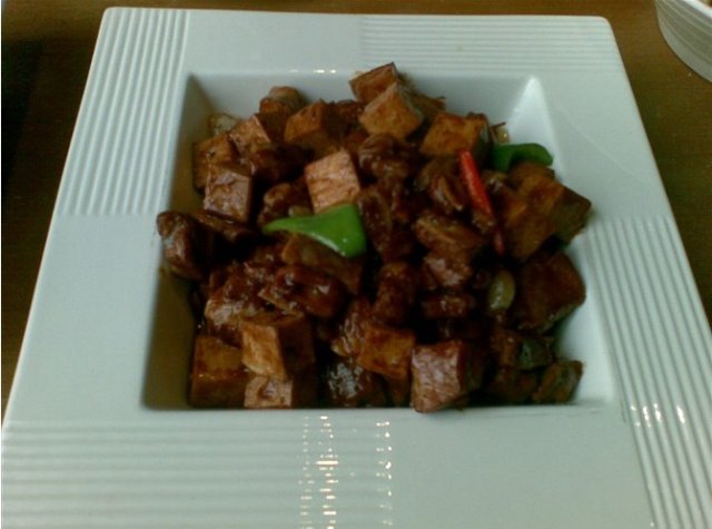 千叶豆腐烧排骨里面无论是排骨还是豆腐都切的很小块,豆腐很入味,不老不嫩很弹牙,排骨上的肉有点少,老谁家小谁吃着很不带劲儿!