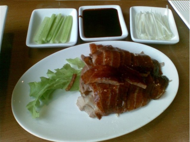 半套烤鸭的味道真不错,赞一个!可是,这只鸭子是不是还未成年就被你们抓来了,半套就这么点肉?!我看也就1/4只鸭子肉!春饼真是够薄的,真见功夫;那个黄瓜条太少了点吧,我们不够吃又要了一碟,还行,没废话,又给了点。