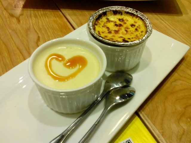 甜点吃了两种好像是焦糖布丁和烤布丁,分量有点小,焦糖的上面有层薄薄的白巧克力加下面凉凉的布丁,甜度刚好,冰冰凉凉的像吃冰激凌,烤布丁上面有层皮皮像烤蛋挞,下面布丁里面有西米、玉米粒、饭豆啥的。两种各有各的特色,都挺好吃。