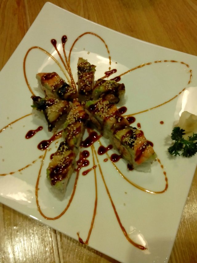 【菜品】寿司的名字很有意思,什么富豪卷、厚脸皮卷,我们点的#彩蝶卷# 摆盘精致华丽,挺漂亮的,寿司内容丰富,上面是鳗鱼虾芝麻,米饭包裹海苔蟹肉虾等等,味道已经调好,不用再蘸酱油芥末。