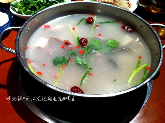 来自洞庭湖的斑鱼清汤鲜香醇美,刺身剔透爽口,鱼片鲜嫩涮八秒即熟,中间鱼片部位Q弹嫩爽。