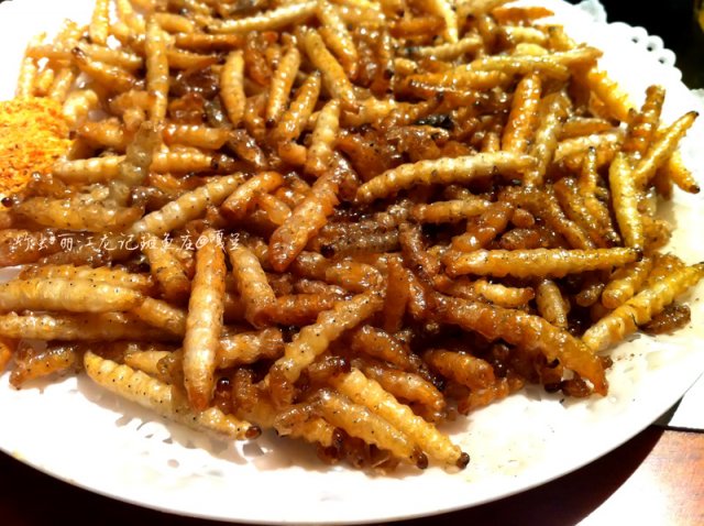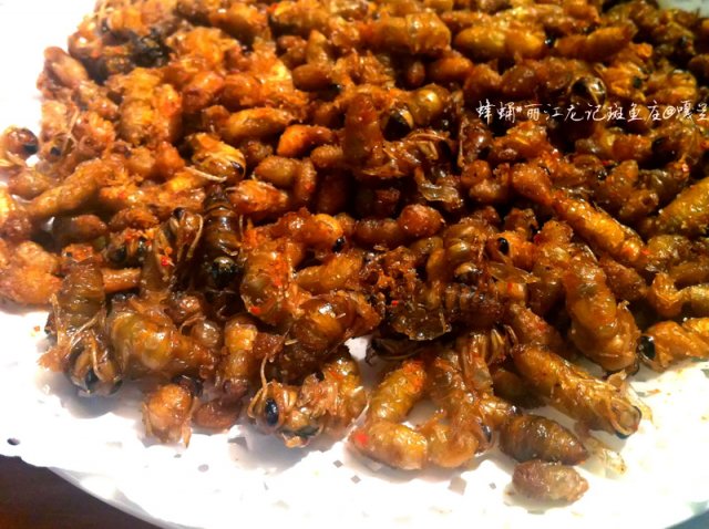 胆大的TX可以尝试这里的蜂蛹、蚂蚱和竹虫...最推荐的是蜂蛹,脆香且营养最为丰富。