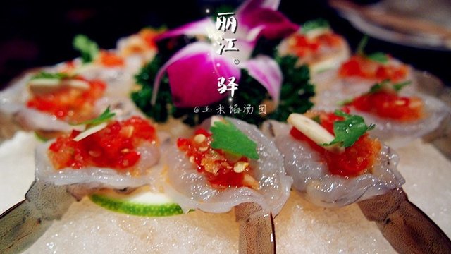 大虾刺生。新鲜虾肉没有一点腥味,配上辣椒这样的搭配外面很少见呢,入口吸溜吸溜~冰冰的又微微辣~很是开胃哦!