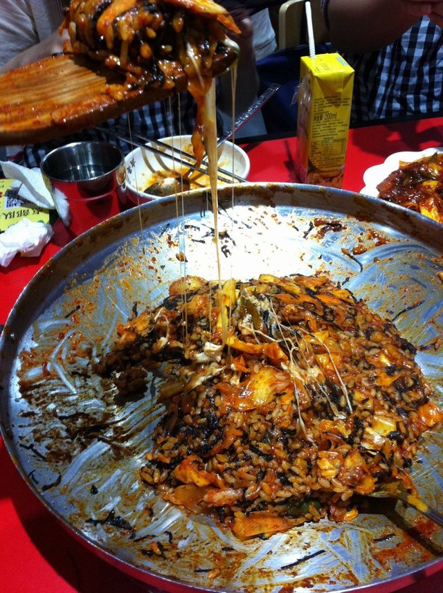 铁板烧吃到后面还剩一部分的时候,加入米饭、海苔丝一起翻炒,最后在里面埋入芝士!再焖个2-3分钟,翻起的时候,芝士的拉丝很长哦!特别得香!这时候已经吃了很饱了,但是抵挡不住这个芝士炒饭的诱惑啊。