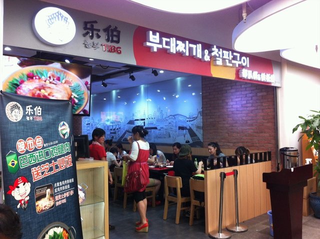 韩国直营店乐伯部队锅入驻上海啦,第一家在吴江路四季坊B1层,在麦当劳的旁边,门面不是很大,墙壁是用红色的砖块一块块搭起来的,大桌不是很多,以两人桌为主。餐具、餐巾纸是自助领取的,就在桌子的旁边抽屉里。