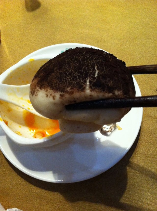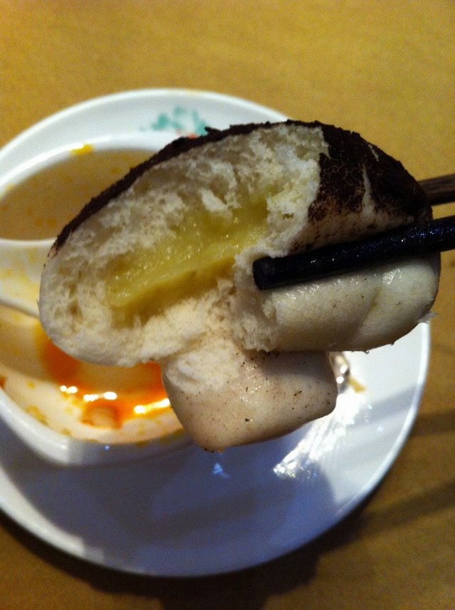 24元三个,大爱!做成香菇的样子,名字是不是应该叫榴莲香菇包呢哈哈,上面黑咖啡色的是巧克力粉,新鲜出炉太赞了!大家一定要来试一试这个啊,咬一口,榴莲馅爆出来了。